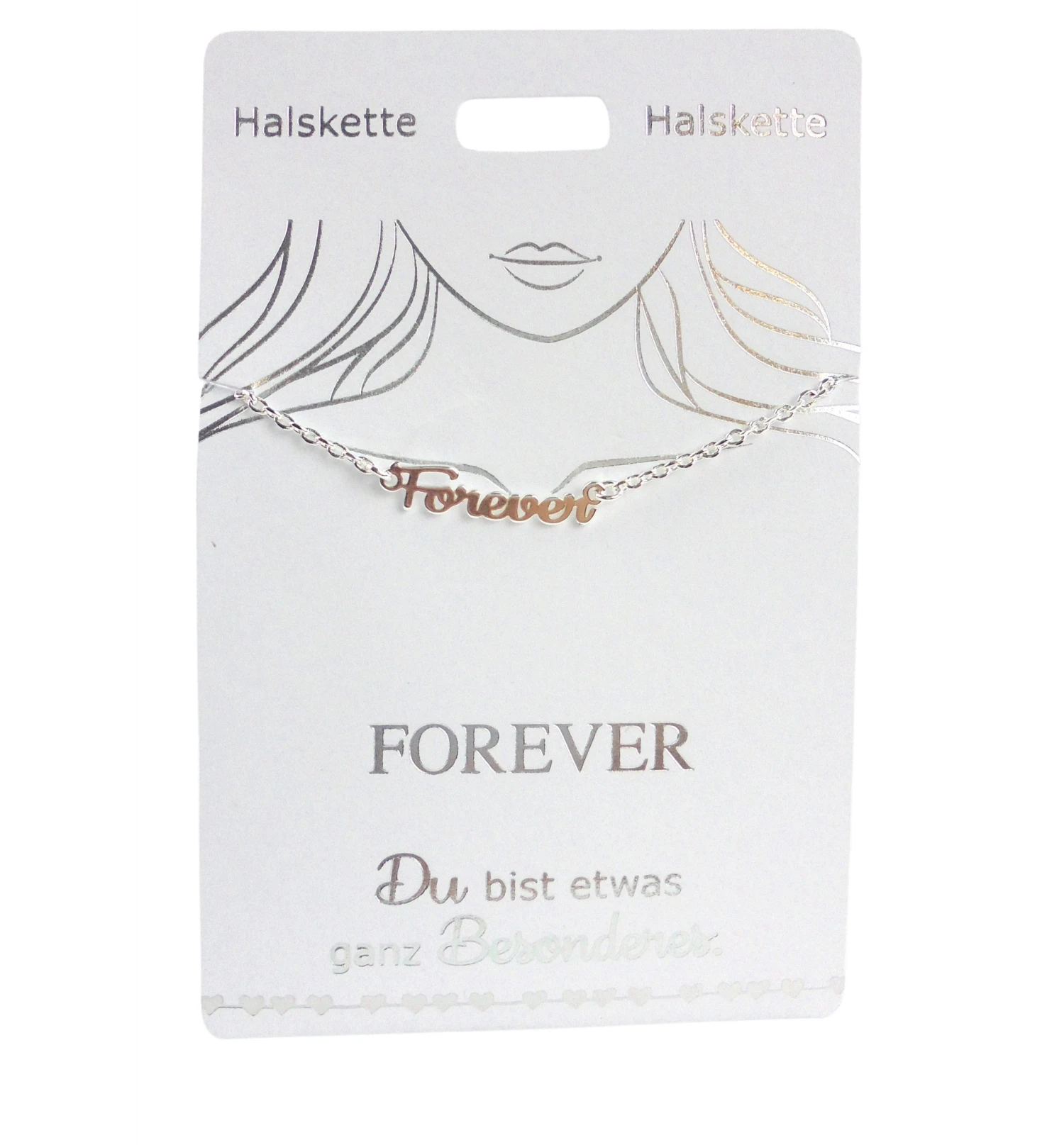 Verschenke die filigrane, versilberte Halskette von Depesche mit dem Schriftzug: “Forever” als Zeichen der Verbundenheit.