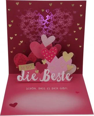 Bei diesen Karten bleibt kein Wunsch offen: tolles Design, Musik, Licht und Pop-up! Egal ob Geburtstag, Hochzeit, Geburt oder Taufe: unter den 56 verschiedenen Motiven der Pop-up-Musikkarten findet sich das Richtige für jeden Anlass! Eine besondere Karte für einen besonderen Moment im Leben! Diese Glückwunsch-Karte ist nicht nur total süß gestaltet, wenn man sie öffnet entfaltet sich ein tolles Pop-up Bild und sie spielt das Lied “The Best”! Dazu gibt es einen Licht-Effekt.
