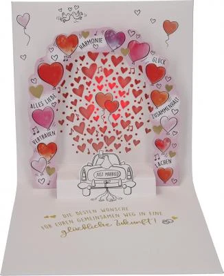 Bei diesen Karten bleibt kein Wunsch offen: tolles Design, Musik, Licht und Pop-up! Egal ob Geburtstag, Hochzeit, Geburt oder Taufe: unter den 56 verschiedenen Motiven der Pop-up-Musikkarten findet sich das Richtige für jeden Anlass! Klappt man diese wunderschöne Hochzeits-Karte auf, entfaltet sich ein tolles Pop-up Element! Zusätzlich gibt es einen Licht-Effekt und die Karte spielt das Lied “Marry You”!