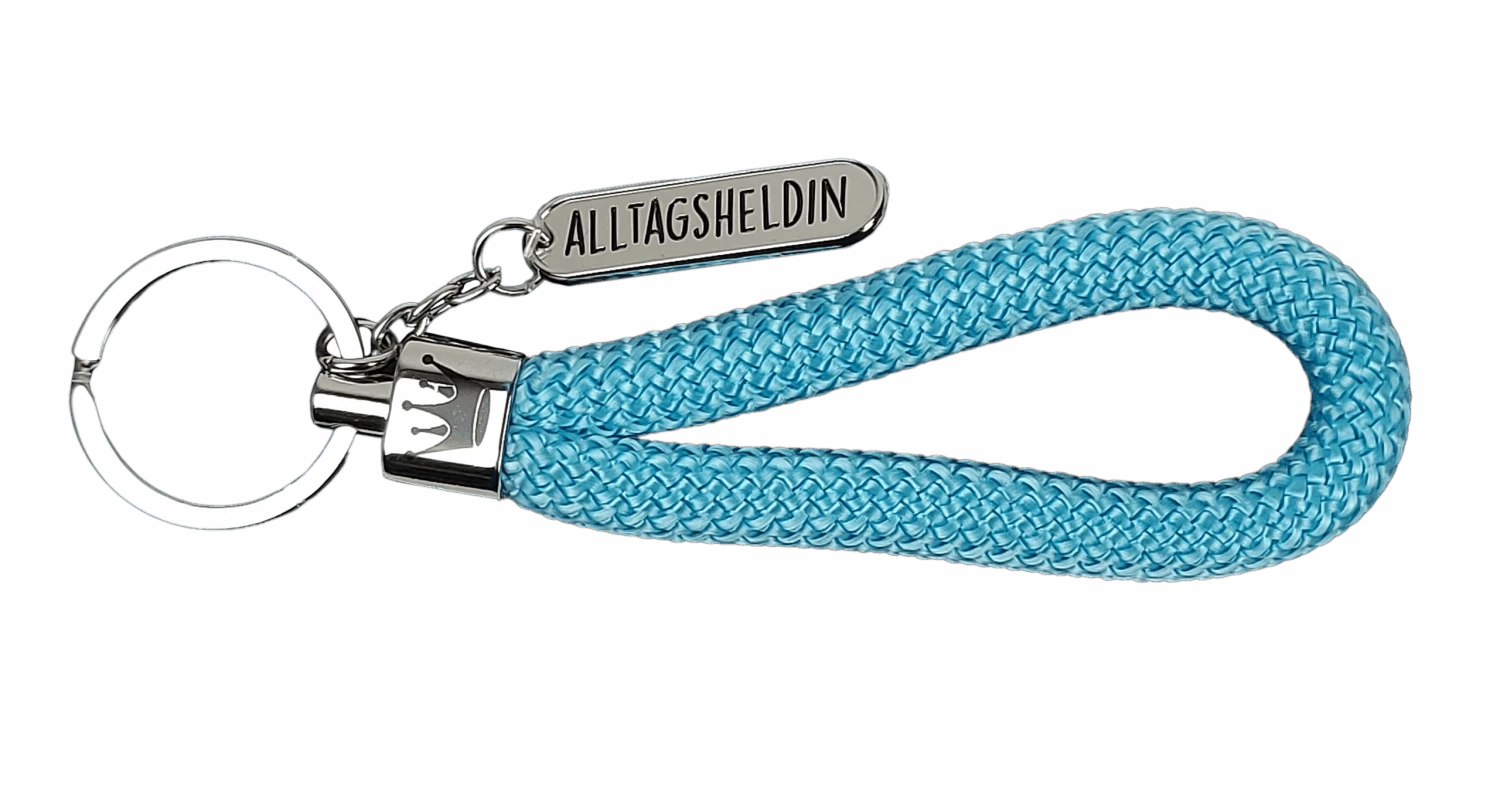 Der Schlaufen-Schlüsselanhänger “Alltagsheldin” aus der “Vergiss mich nicht”-Kollektion von Depesche – ein schönes Geschenk für einen besonderen Menschen! Der Anhänger besteht aus einer geflochtenen Kordel aus Polyester. Sie wird von einer verchromten Metall-Fassung mit einem Kronen-Symbol darauf zusammengehalten. An dieser Fassung ist auch der hochwertige Schlüsselring befestigt, der das Anbringen ans Schlüsselbund (oder den Rucksack!) zum Kinderspiel macht. Über eine kurze Kette ist am Schlüsselring außerdem ein weiterer kleiner Anhänger angebracht. Er hat die Form einer Plakette und trägt den Schriftzug “Alltagsheldin”.