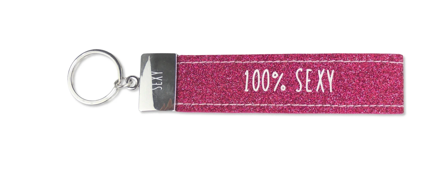 Dieser kultig bedruckte Schlüsselanhänger besteht aus einer Filzschlaufe, mit Sticknaht und einem Metallabschluss. Das Schlüsselband ist mit einem coolen, lustigem oder liebevollen Spruch auf der Vorderseite bedruckt. In diesem Fall ist das glitzernde Filzband in der Farbe Pink, mit der Aufschrift “100% Sexy””. Auf dem Metallabschluss ist ebenfalls nochmal “Sexy” gedruckt.