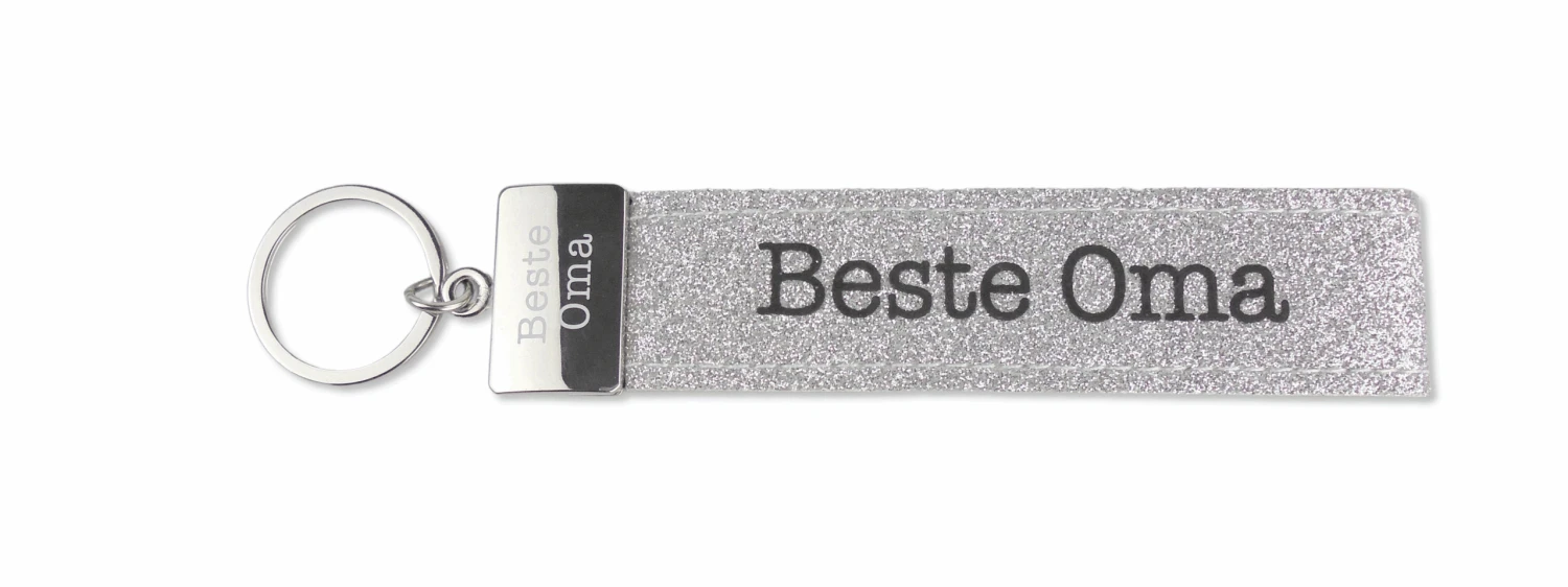 Dieser kultig bedruckte Schlüsselanhänger besteht aus einer Filzschlaufe, mit Sticknaht und einem Metallabschluss. Das Schlüsselband ist mit einem coolen, lustigem oder liebevollen Spruch auf der Vorderseite bedruckt. In diesem Fall ist das glitzernde Filzband in der Farbe Silber, mit der Aufschrift “Beste Oma”. Auf den Metallabschluss ist ebenfalls nochmal “Beste Oma” gedruckt.