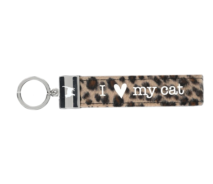 Dieser kultig bedruckte Schlüsselanhänger besteht aus einer Filzschlaufe, mit Sticknaht und einem Metallabschluss. Das Schlüsselband ist mit einem coolen, lustigem oder liebevollen Spruch auf der Vorderseite bedruckt. In diesem Fall ist hat Filzband ein Leoparden-Muster mit der Aufschrift “I ♥ my cat”. Auf dem Metallabschluss ist dazu eine “Katze” gedruckt.