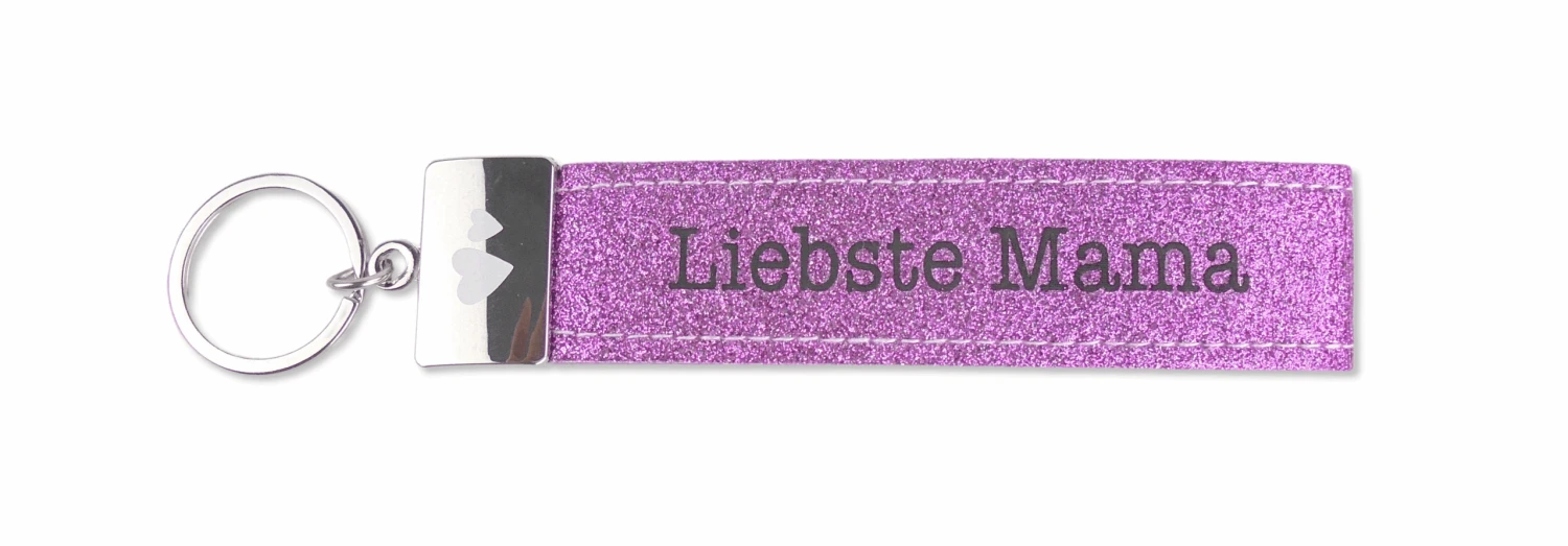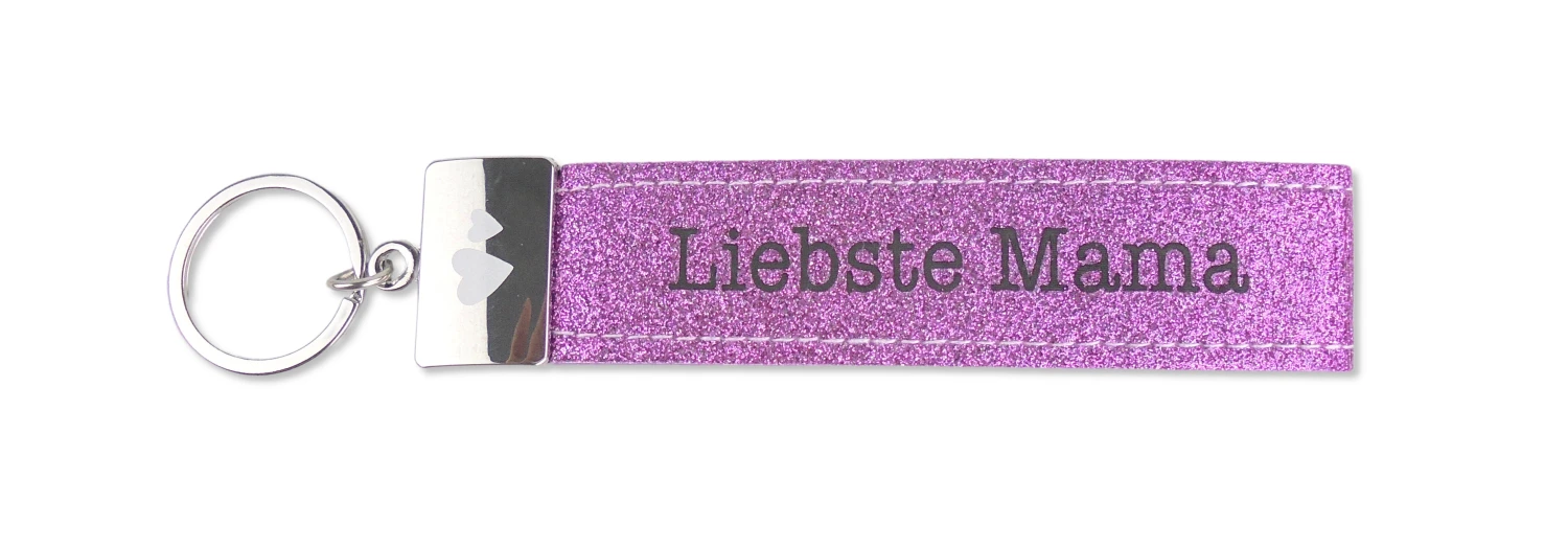 Dieser kultig bedruckte Schlüsselanhänger besteht aus einer Filzschlaufe, mit Sticknaht und einem Metallabschluss. Das Schlüsselband ist mit einem coolen, lustigem oder liebevollen Spruch auf der Vorderseite bedruckt. In diesem Fall ist das glitzernde Filzband in der Farbe Rosa, mit der Aufschrift “Liebste Mama”. Auf den Metallabschluss sind außerdem zwei Herzen gedruckt.