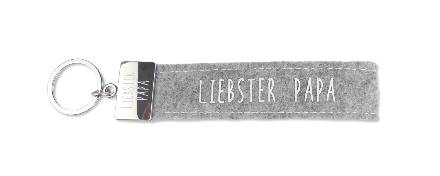 Dieser kultig bedruckte Schlüsselanhänger besteht aus einer Filzschlaufe, mit Sticknaht und einem Metallabschluss. Das Schlüsselband ist mit einem coolen, lustigem oder liebevollen Spruch auf der Vorderseite bedruckt. In diesem Fall ist das Filzband in der Farbe Grau, mit der Aufschrift “Liebster Papa”. Auf den Metallabschluss ist ebenfalls noch einmal “Liebster Papa” gedruckt.