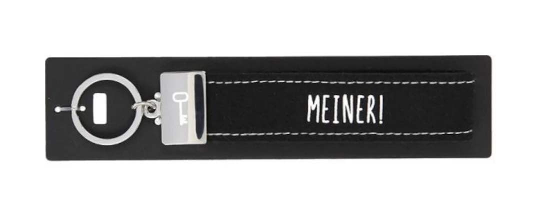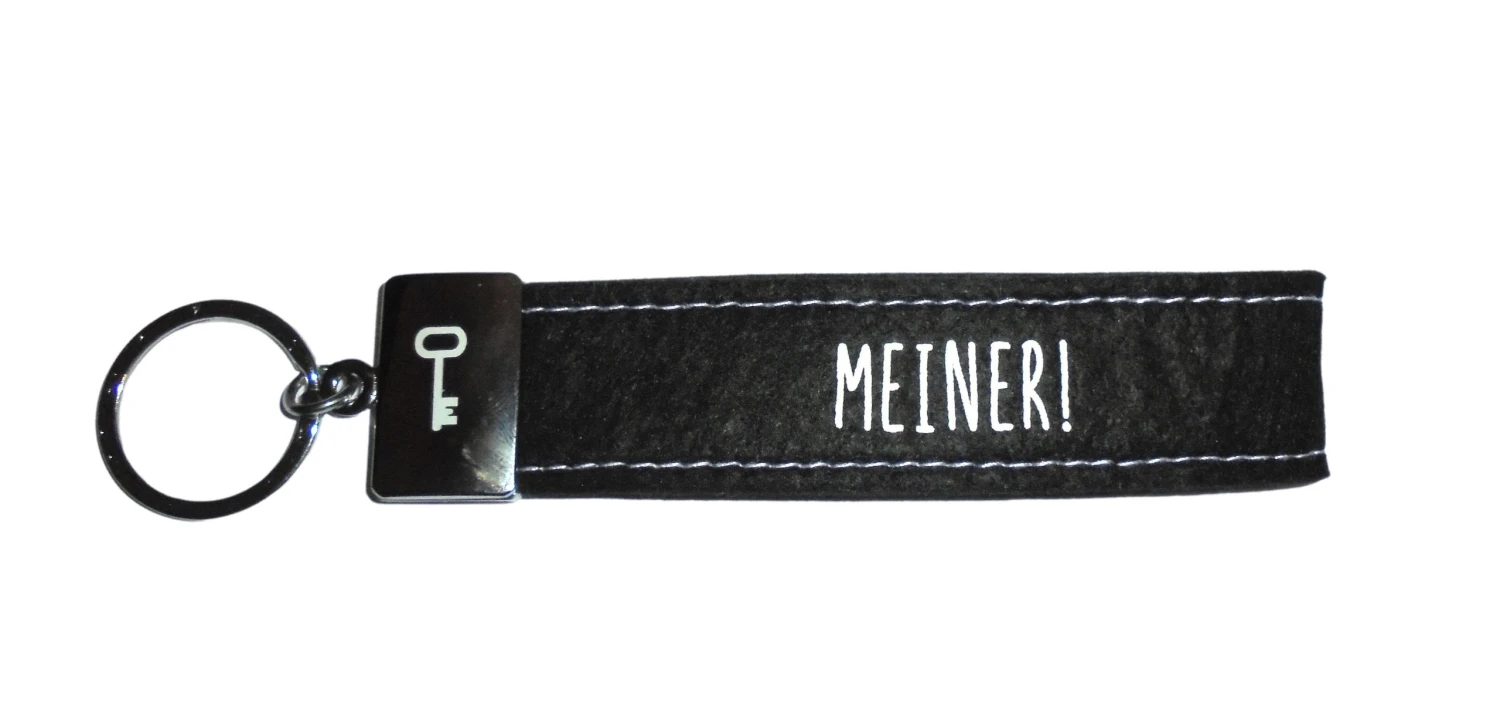 Dieser kultig bedruckte Schlüsselanhänger besteht aus einer Filzschlaufe, mit Sticknaht und einem Metallabschluss. Das Schlüsselband ist mit einem coolen, lustigem oder liebevollen Spruch auf der Vorderseite bedruckt. In diesem Fall ist das Filzband in der Farbe Schwarz, mit der Aufschrift “Meiner”. Auf dem Metallabschluss ist außerdem passend dazu ein Schlüssel gedruckt.