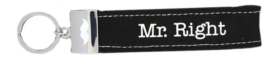 Dieser kultig bedruckte Schlüsselanhänger besteht aus einer Filzschlaufe, mit Sticknaht und einem Metallabschluss. Das Schlüsselband ist mit einem coolen, lustigem oder liebevollen Spruch auf der Vorderseite bedruckt. In diesem Fall ist das Filzband in der Farbe schwarz, mit der Aufschrift “Mr. Right”. Auf dem Metallabschluss ist passend dazu eine ein Schnauzbart gedruckt.