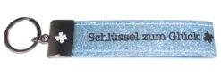 Dieser kultig bedruckte Schlüsselanhänger besteht aus einer Filzschlaufe, mit Sticknaht und einem Metallabschluss. Das Schlüsselband ist mit einem coolen, lustigem oder liebevollen Spruch auf der Vorderseite bedruckt. In diesem Fall ist das Filzband mit Glitzereffekt in der Farbe Hellblau, mit der Aufschrift “Schlüssel zu Glück” und einem Kleeblatt versehen. Auf den Metallabschluss ist ebenfalls nochmal das Kleeblatt gedruckt.