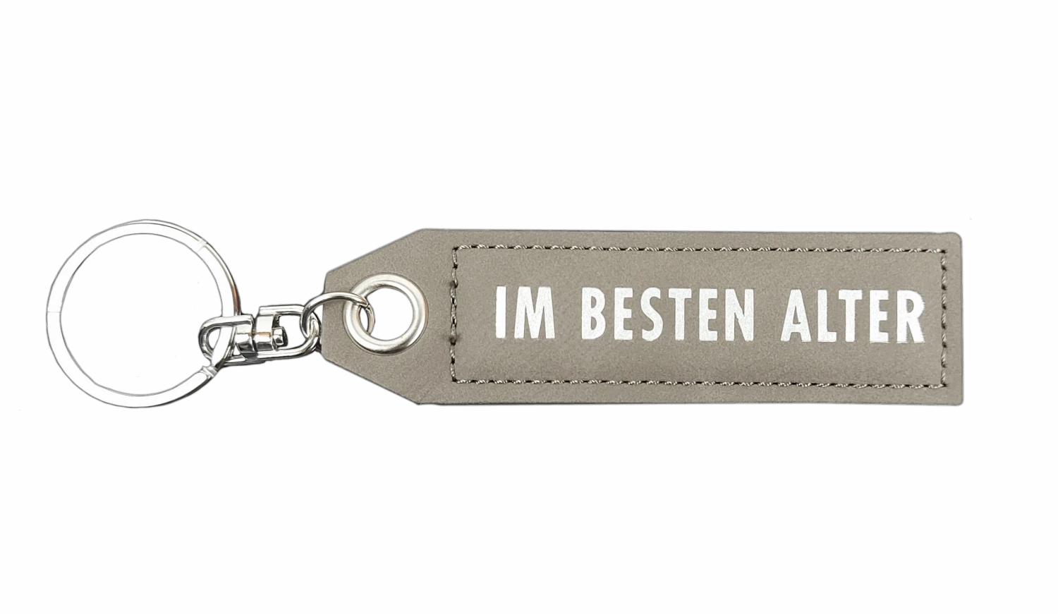 Der Schlüsselanhänger “Im besten Alter” – Leder aus der “Vergiss mich nicht”-Kollektion von Depesche – ein schönes Geschenk für einen besonderen Menschen! Der Anhänger ist aus farbigem Kunstleder gefertigt. Der aufgedruckte Schriftzug “Im besten Alter” wird eingefasst von einer Ziernaht in der gleichen Farbe, die auch das Kunstleder hat. Ein hochwertiger Schlüsselring zur einfachen Befestigung am Schlüsselbund (oder an Handtasche oder Rucksack!) ist gleich mit dabei! Dieser ist über einen Drehwirbel an einer Metall-Öse befestigt, die in das Leder eingelassen ist.