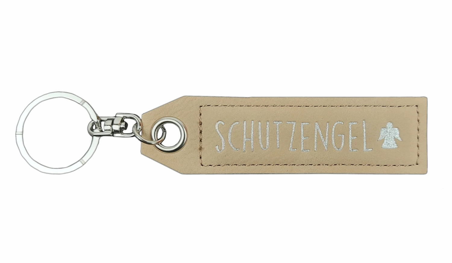 Der Schlüsselanhänger “Schutzengel” – Leder aus der “Vergiss mich nicht”-Kollektion von Depesche – ein schönes Geschenk für einen besonderen Menschen! Der Anhänger ist aus farbigem Kunstleder gefertigt. Der aufgedruckte Schriftzug “Schutzengel” wird eingefasst von einer Ziernaht in der gleichen Farbe, die auch das Kunstleder hat. Ein hochwertiger Schlüsselring zur einfachen Befestigung am Schlüsselbund (oder an Handtasche oder Rucksack!) ist gleich mit dabei! Dieser ist über einen Drehwirbel an einer Metall-Öse befestigt, die in das Leder eingelassen ist.