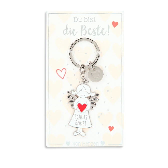 Der kleine Schutzengel Anhänger weiß – “Du bist die Beste!” aus dem Hause Depesche hält ein kleines, rotes Herz in seinen Händen. Darunter trägt er das Wort “Schutzengel” auf dem Rock. Das Herz findet sich auch auf dem kleinen, silbernen Extra-Anhänger wieder, der am Schlüsselring befestigt ist.