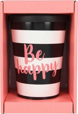 Dieser stylishe Trinkbecher mit dem Spruch Be Happy für unterwegs sorgt für beste Laune. Ob heißer Tee, kühle Limo oder Wasser: Dank der verschließbaren Trinköffnung geht nichts daneben.